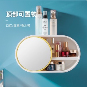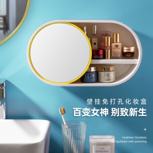 SPENG 化妆品收纳盒浴室收纳盒壁挂式免打孔带镜子洗手间洗涑台化妆盒储物首饰盒收纳 黄色镜框(可移动镜子)