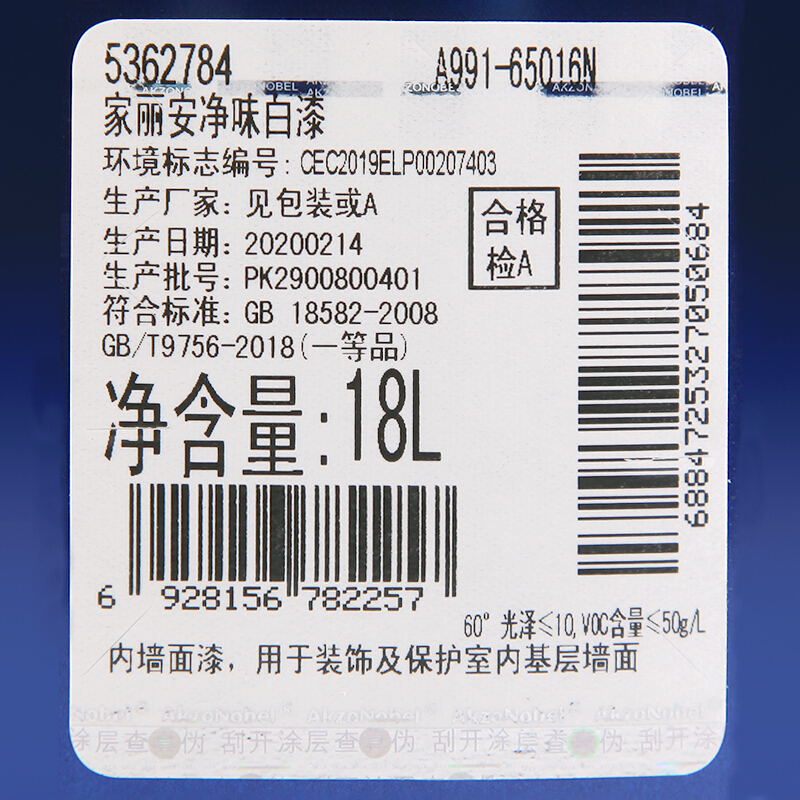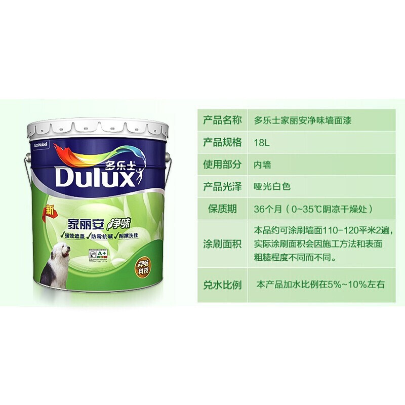 商品名称:多乐士(dulux)A991 家丽安净味 内墙乳胶漆 油漆涂料 墙面漆18L