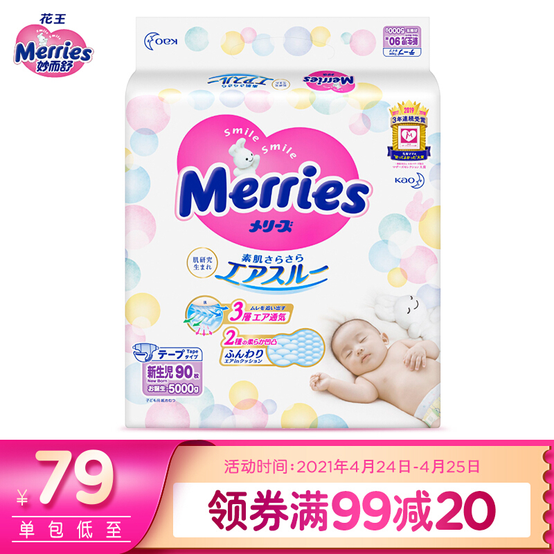 花王妙而舒Merries婴儿纸尿裤 NB90片(出生-5kg)新生儿小号婴儿尿不湿(日本进口)纸尿片