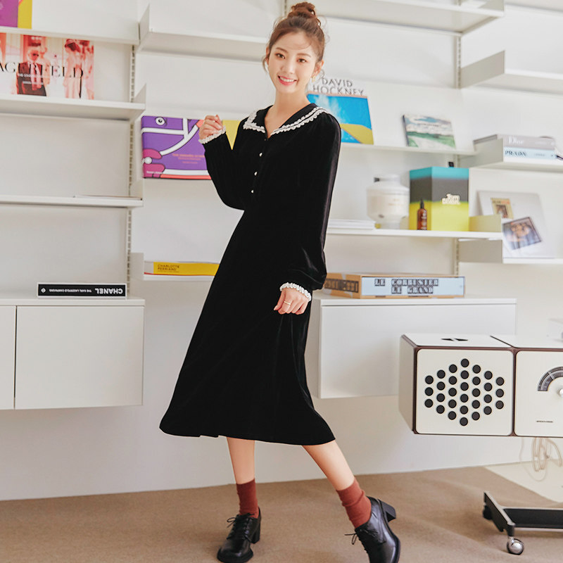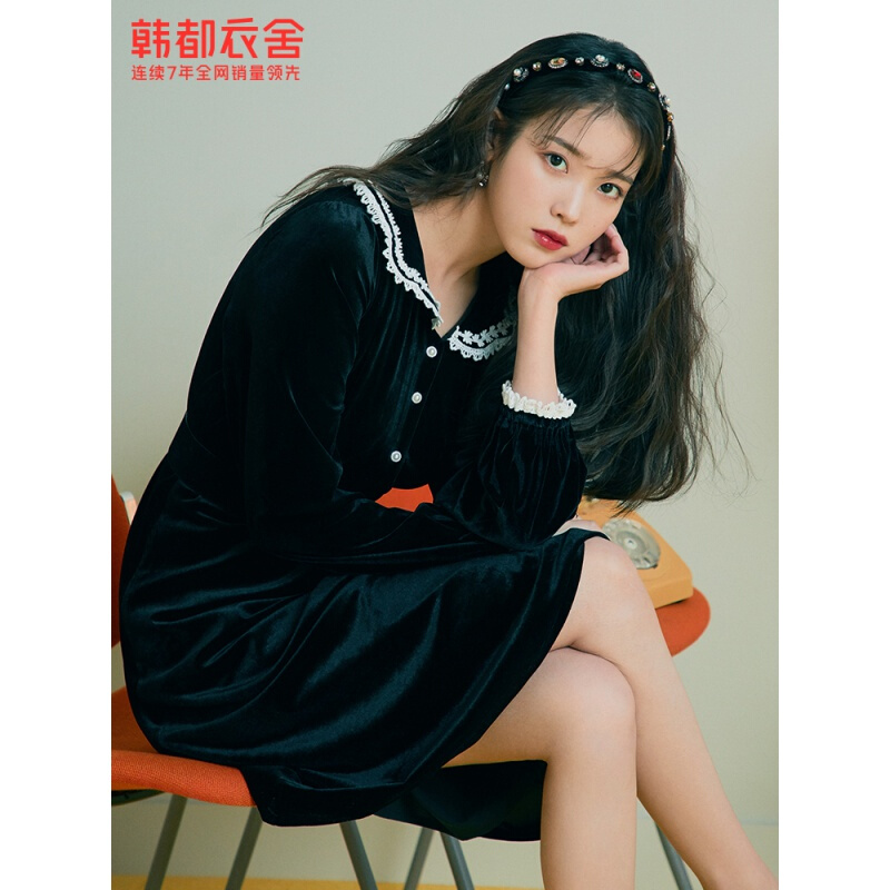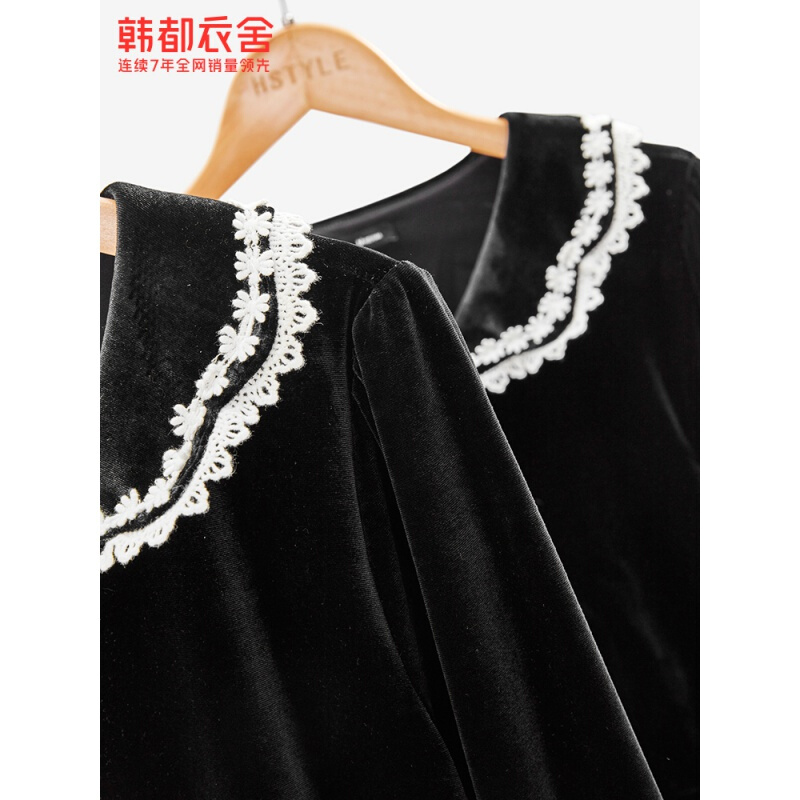 韩都衣舍2021春季新款法式复古赫本娃娃领丝绒连衣裙女RJ6132 黑色 M