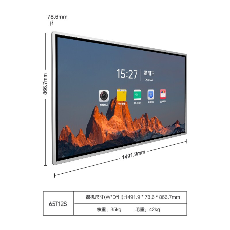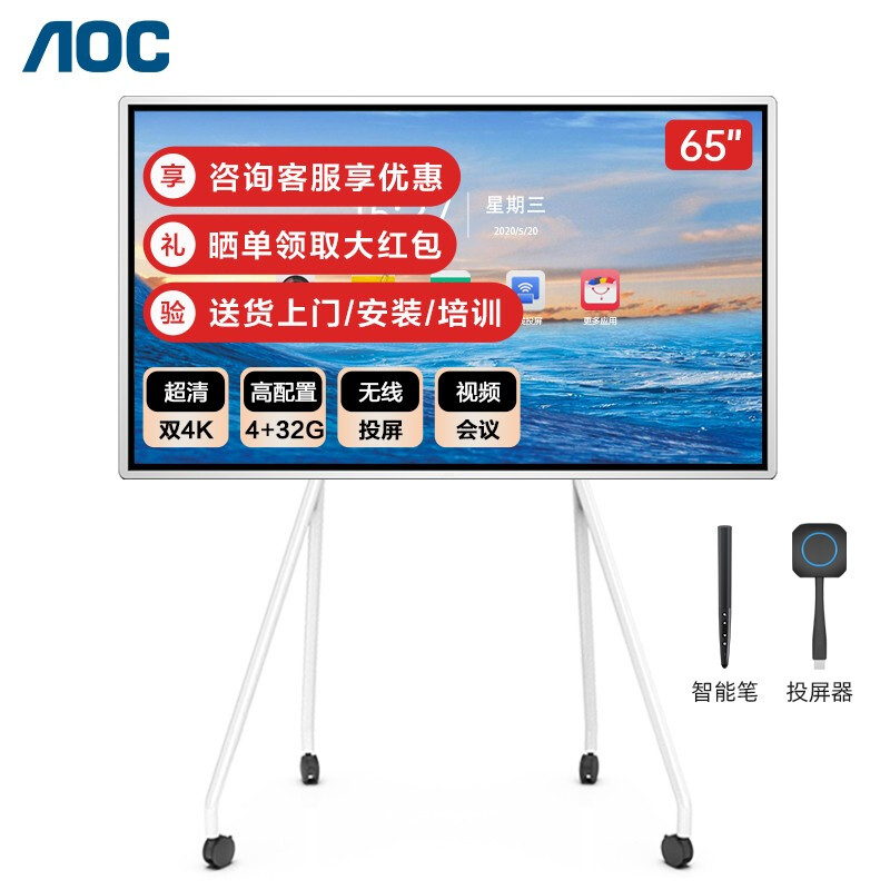 - 商品名称:AOC会议平板65英寸会议一体机4k触控电子白板多媒体教学触摸屏电视显示器商用大屏65T12S+推车+投屏器+智能笔